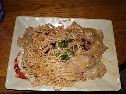 紅油抄手麵他覺得不夠辣...自己又多加很多的辣油下去...